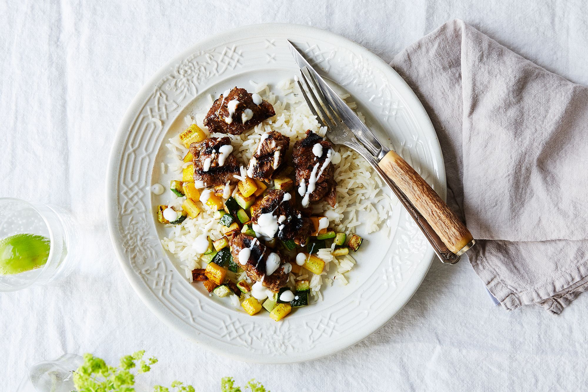 Spiced ribeye steak kebabs with yogurt sauce