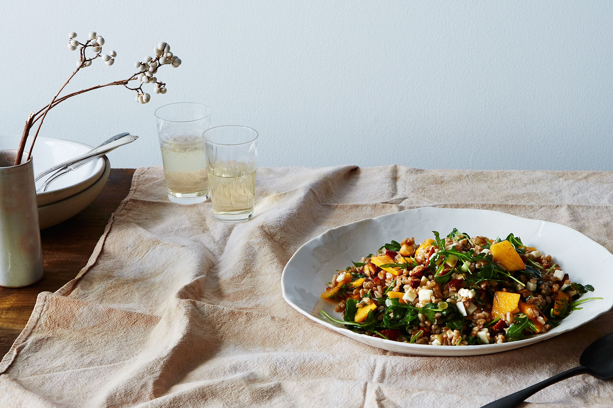 Farro salad with onion confit, persimmon & arugula