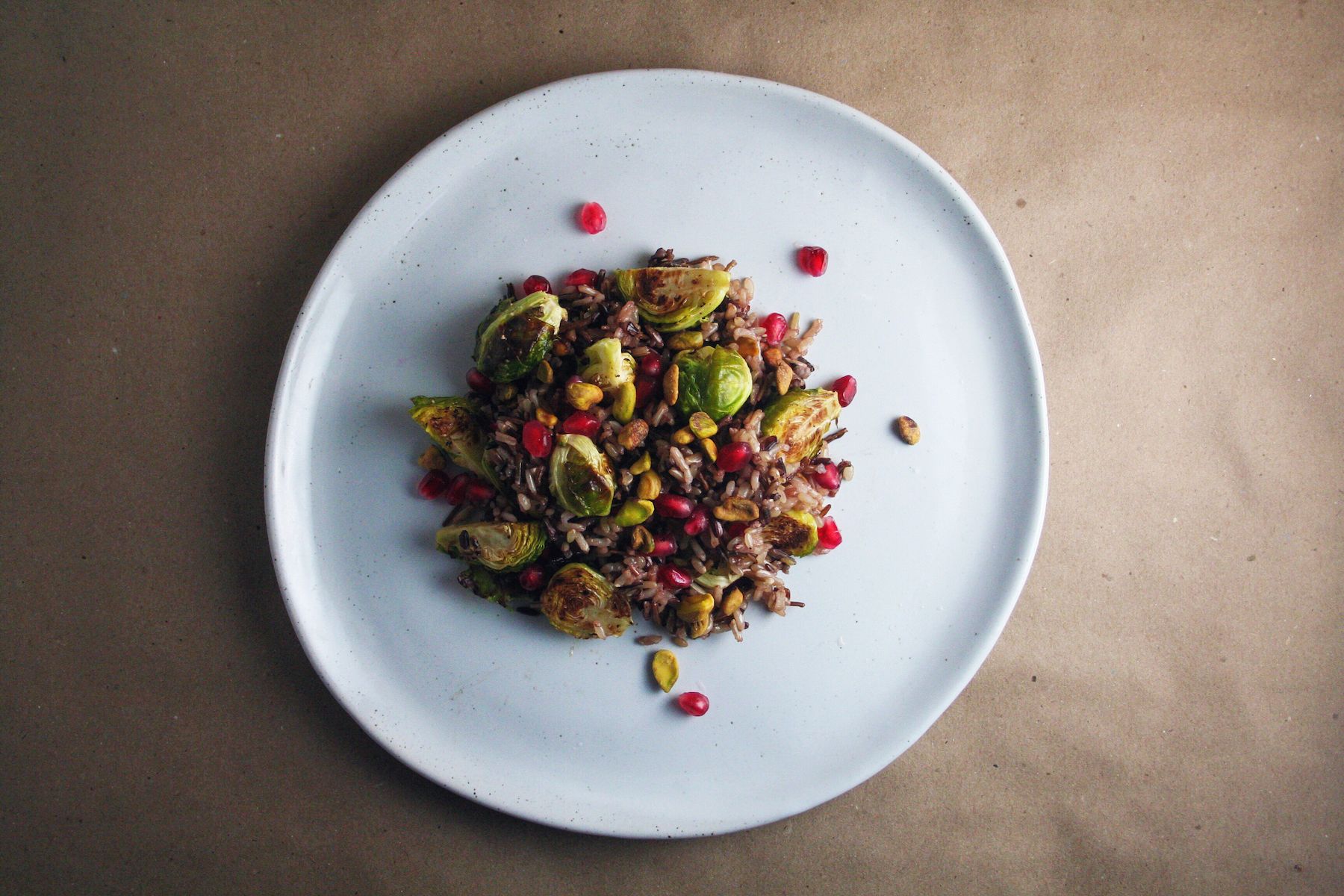 Wild rice with brussels sprouts, pomegranates & pistachios