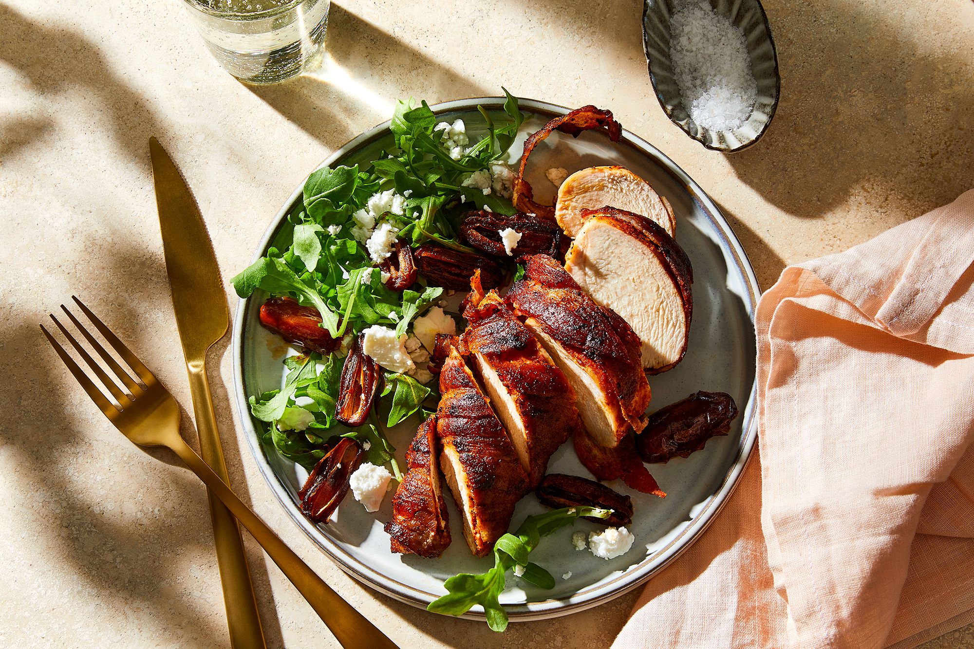 Bacon-wrapped chicken with dates, arugula & blue cheese