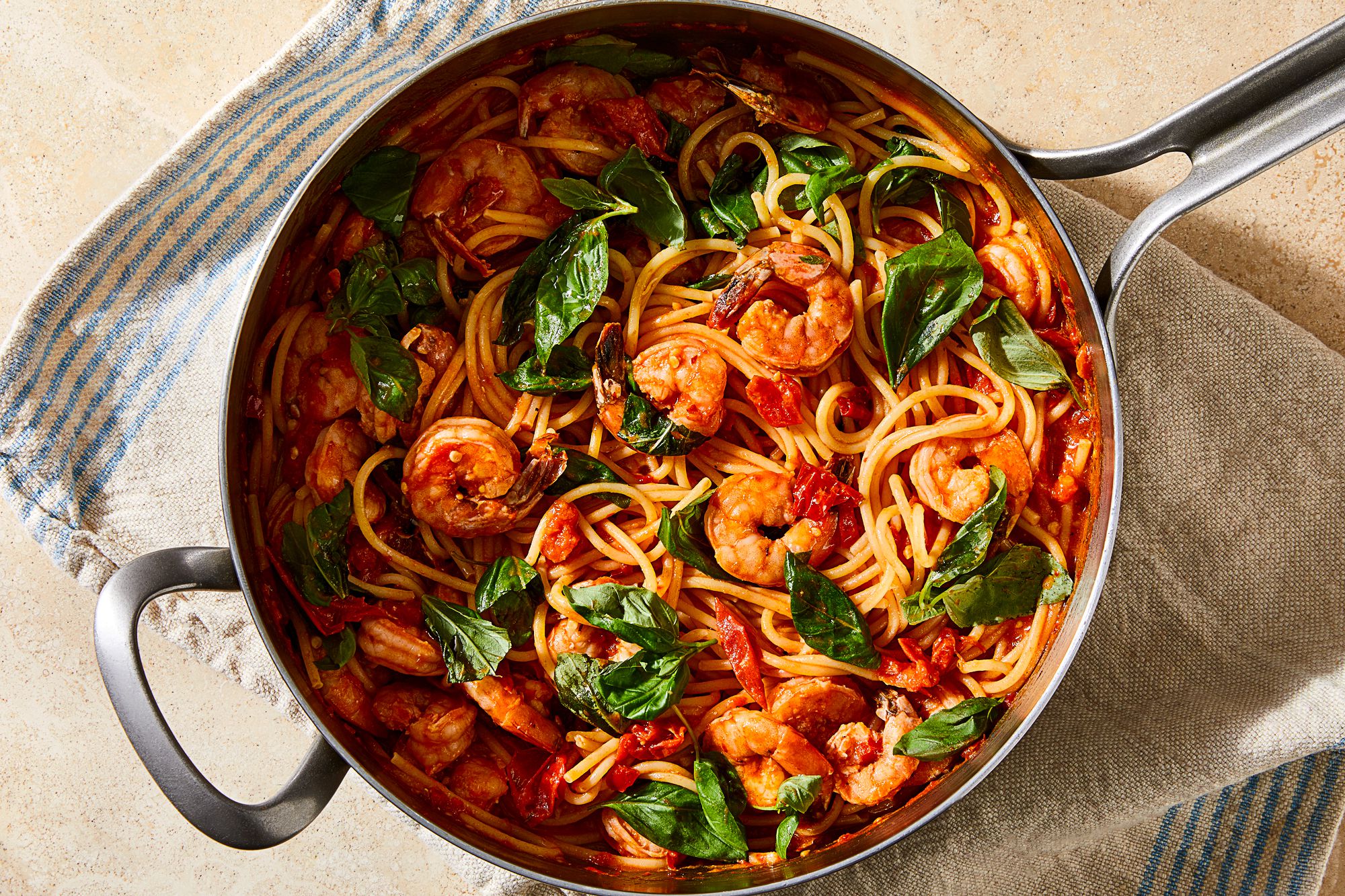 Shrimp spaghetti with tomato, basil & chile butter