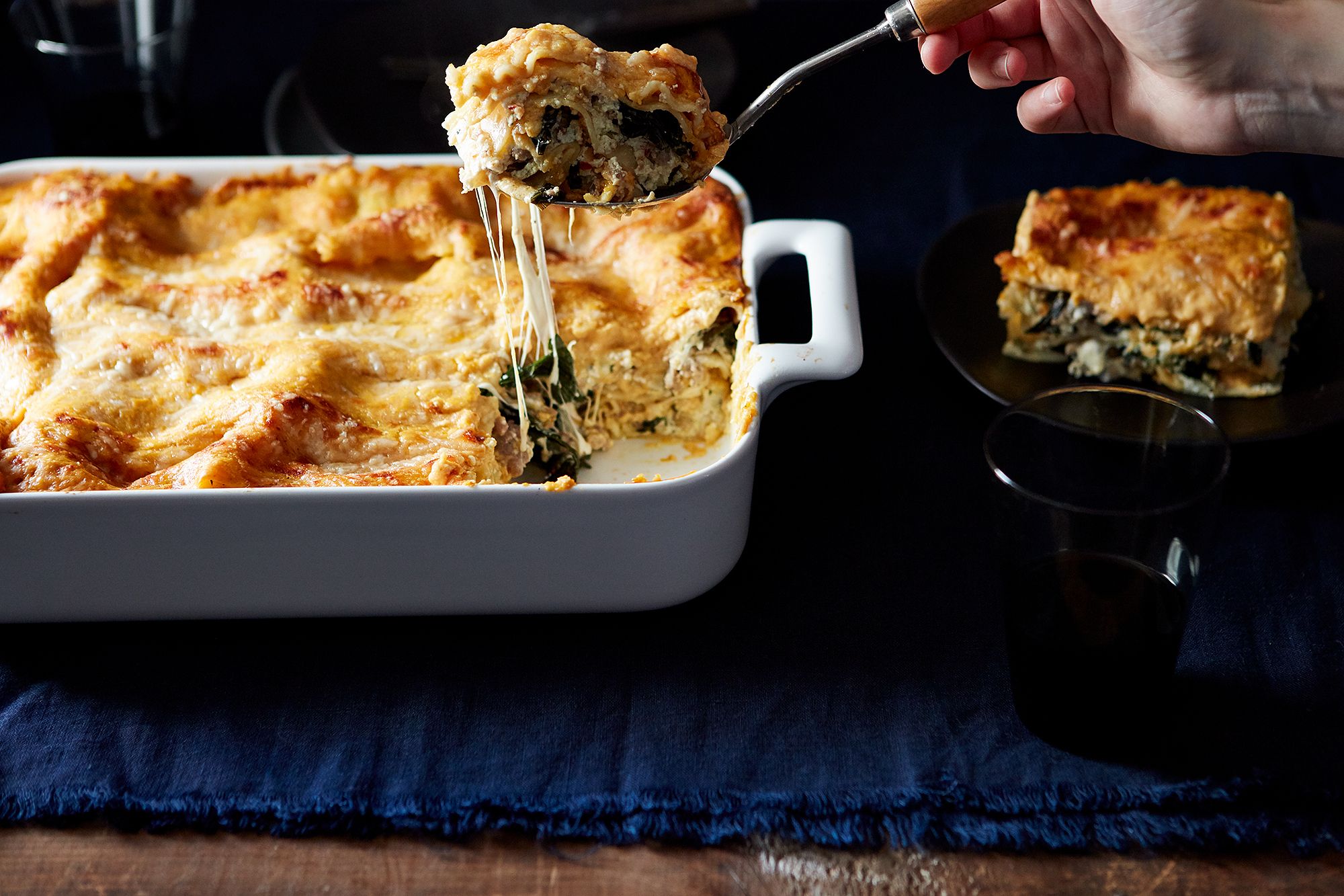 Kale and Italian sausage lasagna with pumpkin bechamel