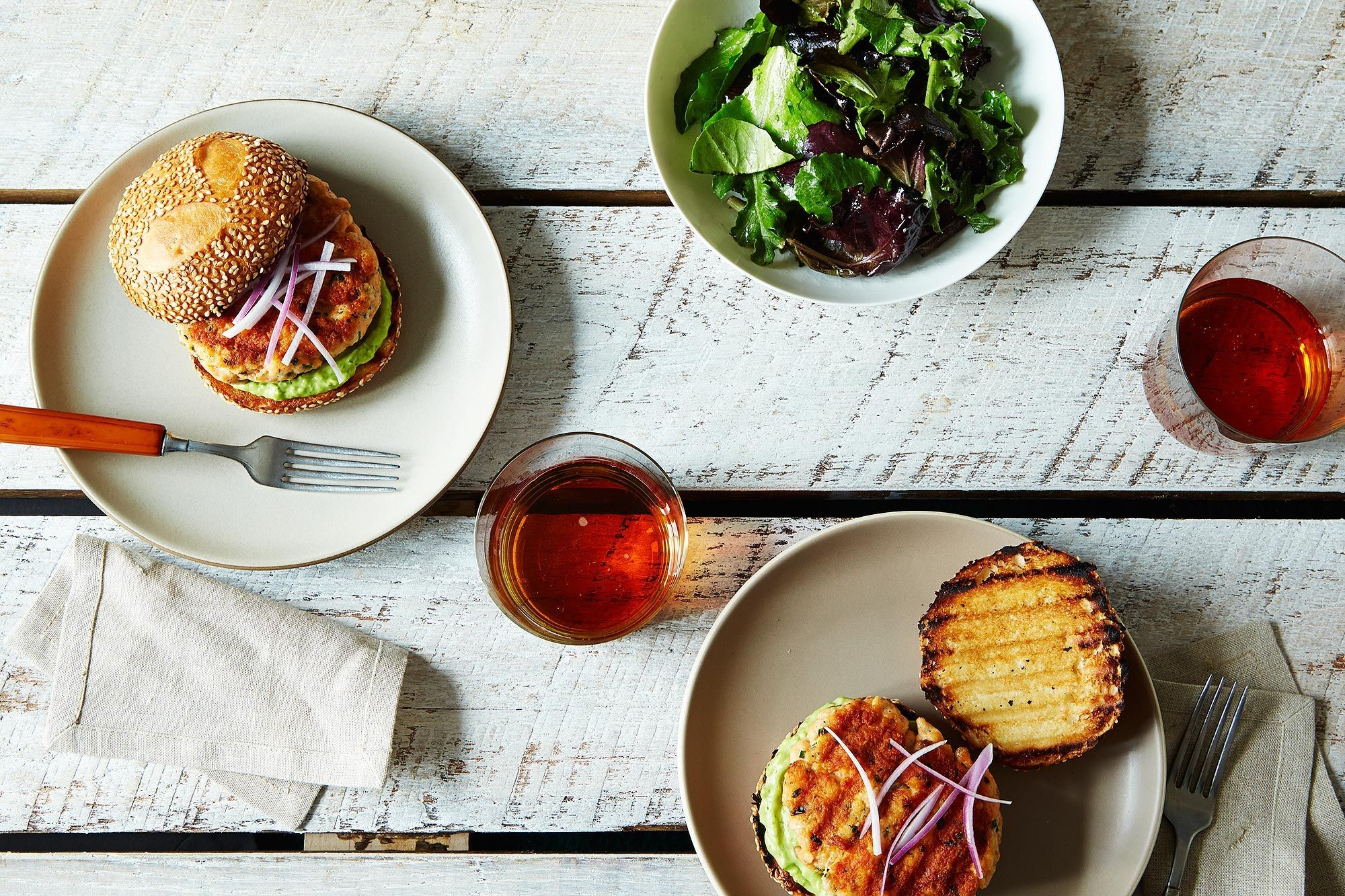 Salmon burgers with avocado aioli