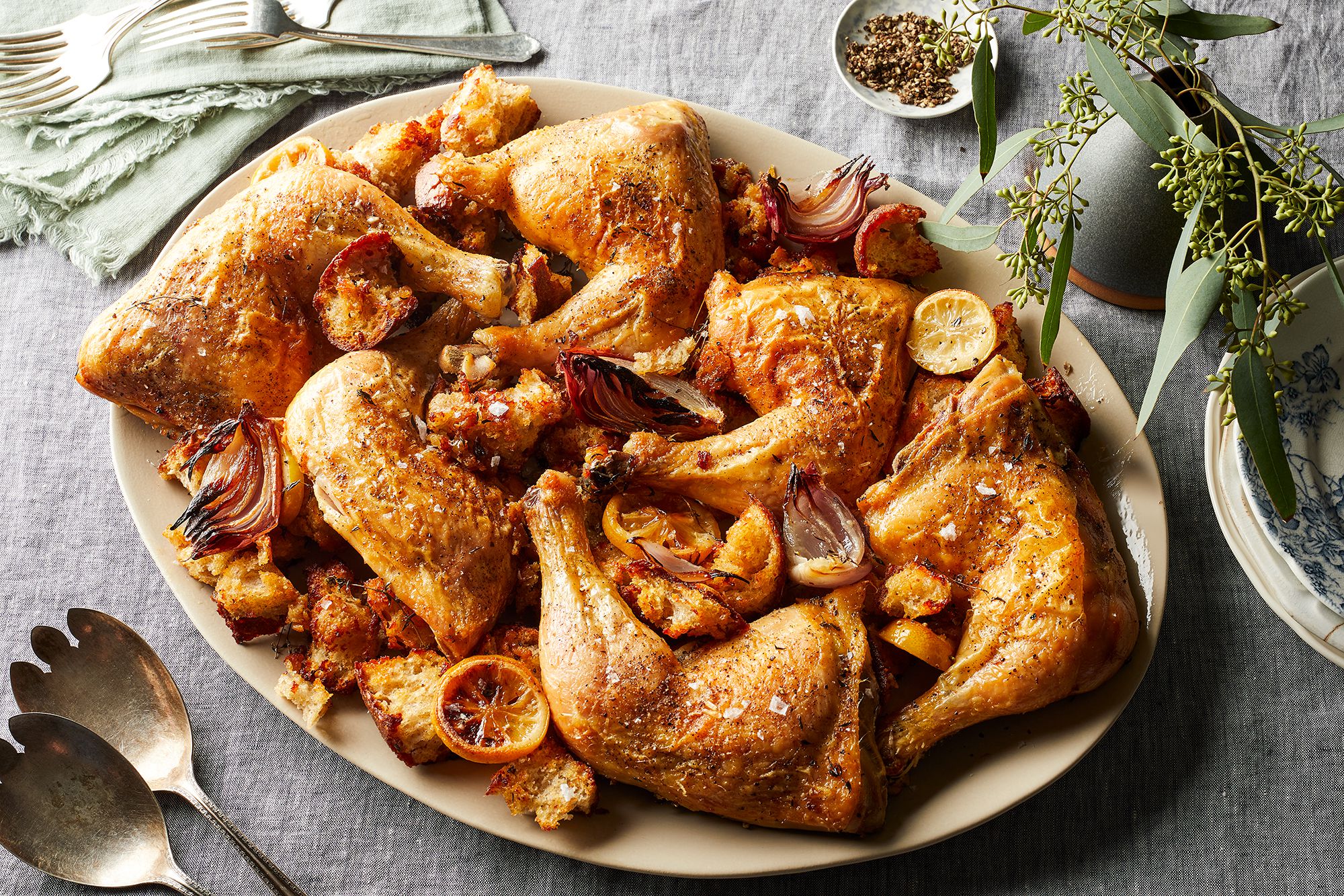 Chicken legs with schmaltzy croutons, roasted onion & lemon